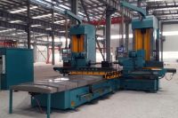 數(shù)控五軸雙立柱鏜床為臥式雙面布置,主要適合加工對(duì)稱度要求高的孔的鏜削加工。并能附帶高速銑削、 低速銑削、鉆孔等功能。工件放在專用移動(dòng)工作臺(tái)上,左右分別兩個(gè)立柱帶可橫向移動(dòng)的滑臺(tái),滑臺(tái)上放動(dòng)力頭。移動(dòng)工作臺(tái)、橫進(jìn)滑臺(tái)及立柱滑臺(tái)由數(shù)控系統(tǒng)控制,主軸轉(zhuǎn)速通過(guò)變頻器調(diào)速。該機(jī)床由一套五軸數(shù)控系統(tǒng)控制,配備兩套懸掛式控制箱,并配可持式手脈。機(jī)床配有獨(dú)立的液壓站,能夠?qū)崿F(xiàn)立柱滑臺(tái)的自動(dòng)鎖緊。運(yùn)動(dòng)部分采用滾珠絲杠連接。機(jī)床配有獨(dú)立的電器柜,并有風(fēng)冷裝置。